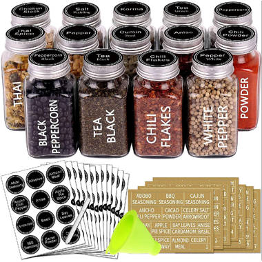 14 Glass Spice Jars w/2 Types of Preprinted Spice Labels. Commercial Grade, Complete Set: 14 Square Empty Jars 4oz, Pour/Sift & Coarse Shakers, ...