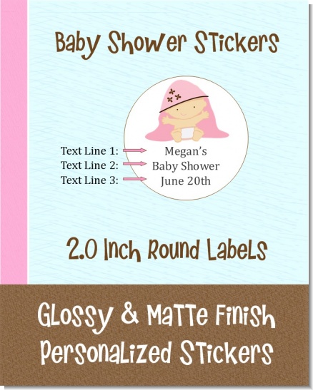 Personalized Baby Shower Sticker Labels - Custom Baby Shower Favors Add some party pizzazz by incorporating our personalized round baby shower sticker label favors to your chosen theme color scheme and decor. Our round stickers are sold in sets and offered in two different sizes and are so easy to use. Simply apply them to party bags, favor treats and more and use them to seal envelopes for your custom baby ...